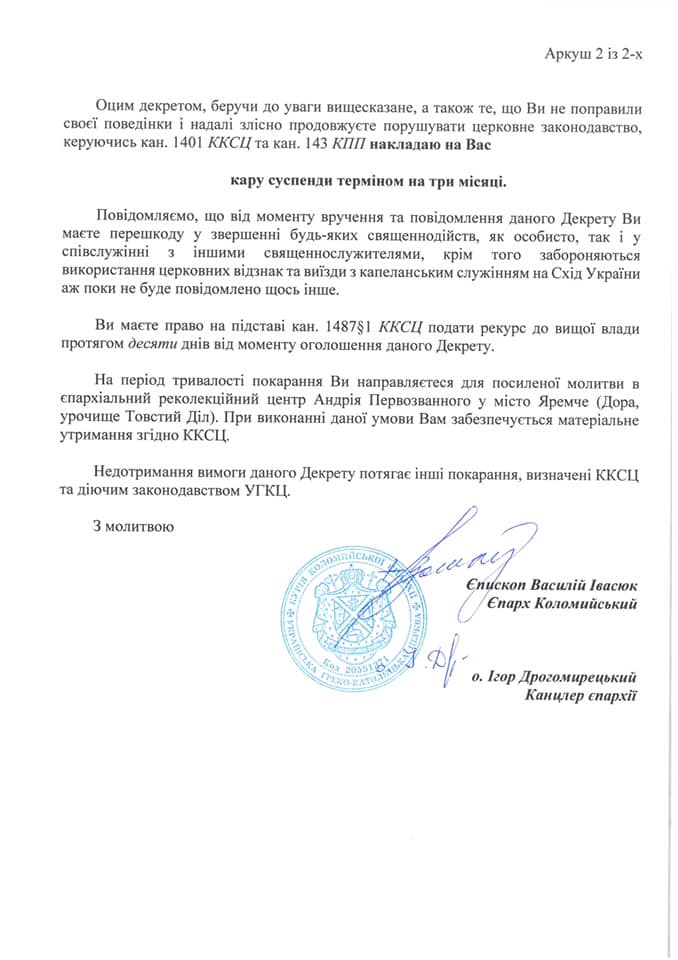 Відповідний декрет опублікували на сторінці Коломийської єпархії УГКЦ, передає Репортер.